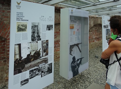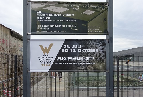 Die Topographie des Terrors an der Niederkirchnerstraße in Berlin-Kreuzberg zeigt bis zum 13. Oktober 2019 eine Ausstellung über den Warschauer Aufstand vom 1. August bis 2. Oktober 1944. Zahlreiche Bild- und Schrifttafeln entlang einer in Fragmenten erhaltenen Kellermauer des in der Nazizeit als Gestapo- und SS-Zentrale genutzten Prinz-Albrecht-Palais schildern, was dem Überfall der deutschen Wehrmacht am 1. September 1939 folgte und wie Bewohner von Warschau am 1. August 1944 und danach mutig und den Tod vor Augen versuchten, sich ihrer Besatzer zu erwehren und einen eigenen Staat zu bilden. Sie taten dies in der Hoffnung, dass die in sicherer Entfernung "Gewehr bei Fuß" wartenden Roten Armee zu ihren Gunsten eingreift und dem Horror der deutschen Horden ein Ende bereitet, was aber Stalin nicht tat, der andere Pläne hatte.