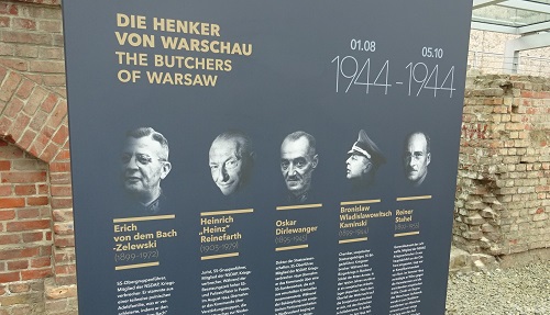 Hitler und Himmler, sein Henker, befahlen zu Beginn des mit selbst gebastelten beziehungsweise aus Depots gestohlenen Waffen geführten Aufstandes, alle Bewohner von Warschau zu töten und keine Gefangenen zu machen. "Warschau soll dem Erdboden gleichgemacht werden, um auf diese Weise ein abschreckendes Beispiel für ganz Europa zu statuieren", befahl Himmler am 1. August 1944. In der Ausstellung wird der Reichsführer SS mit dieser zynischen Aussage vor Wehrkreisbefehlshabern und Schulungsoffizieren am 21. September 1944 so zitiert: "Außerdem habe ich gleichzeitig Befehl gegeben, dass Warschau restlos zerstört wird. Sie können sich nun denken, ich sei ein Barbar. Wenn Sie so wollen, ja, das bin ich, wenn es sein muss. Der Befehlt lautete: Jeder Häuserblock ist niederzubrennen und zu sprengen, so dass sich in Warschau keine Etappe mehr festnisten kann. Die paar Stäbe, die wirklich drin hausen müssen, Soldatenstäbe, gehen gern in den Keller runter. Das sind ja Frontsoldaten. Und Etappenschweine gehen ohnehin nicht gern dahin, wo die Leichen liegen. Scheußlich ist es dort." Generalgouverneur Hans Frank notierte in seinem Tagebuch am 5. August 1944: "Nach diesem Aufstand und seiner Niederschlagung wird Warschau dem verdienten Schicksal seiner völligen Vernichtung mit Recht anheimgefallen sein oder unterzogen werden."