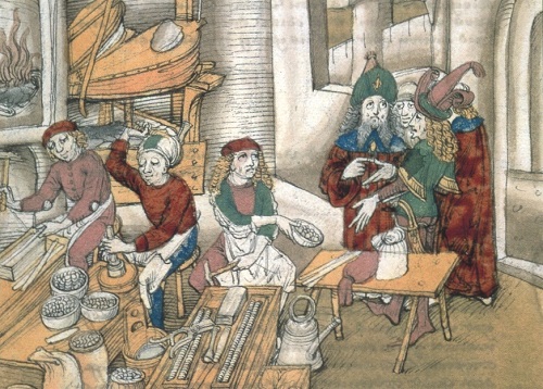 Clio und Moneta an der Spindelpresse