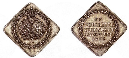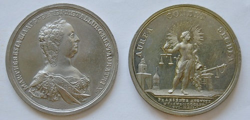 Preis- und Münzbesuchsmedaillen der Kaiserin Maria Theresia würdigen einerseits die Anwesenheit der Monarchin und ihres kaiserlichen Gemahls Franz I. in einer Geldfabrik und andererseits ihr Interesse am staatspolitisch wichtigen Thema Münzprägung und Geldwirtschaft. Gezeigt wird das damals wichtigste Prägegerät, die Spindelpresse. Sie war eine Erfindung des 16. Jahrhunderts und gilt bis heute als Symbol der Münzfertigung schlechthin. In Zeiten, als die altertümliche Prägemaschine schon längst ausgemustert war, hat man sie immer wieder als beliebtes und aussagekräftiges Symbol auch auf Prägungen unserer Zeit verwendet.