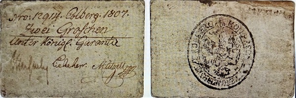 Da im Mai 1807 in Kolberg bei der Belagerung akuter Kleingeldmangel herrschte, behalf man sich für die Bezahlung von Soldaten und Zivilisten mit Papiergeld, das den Hinweis "unter königlicher Garantie" erhielt. Auf der Rückseite hat man das Notgeld mit dem Gouvernementsiegel beglaubigt. Die Notgeldscheine bestehen aus zerschnittenem Papier. Ausgegeben wurden Zettel zu zwei, vier und acht Groschen, die von Schülern des örtlichen Lyzeums mit Tinte beschrieben wurden. Das muss eine langsame und langwierige Arbeit für die Schreiber und die Beamten gewesen sein, die ihren Namen mit schwarzer Tinte hinzufügen mussten. Der Kontrollbeamte Witt setzte mit roter Tinte seinen Namen hinzu, doch es gibt auch Scheine ohne ihn. Das alles macht jedes Stück zu einem besonderen Unikat. Insgesamt hat man Scheine im Wert von 5200 Talern hergestellt, die teilweise erst nach dem Ende der Belagerung am 2. Juli 1807 ausgegeben und bis zum 1. Juni 1808 eingelöst werden konnten. Allerdings haben manche Kolberger das eine oder andere Exemplar als Andenken an eine schlimme Belagerungszeit aufgehoben, weshalb der Münz- und Papiergeldhandel ab und zu eine solche Rarität anbieten kann. In Museen und Münzkabinetten sind die Kolberger Notgeldscheine ebenfalls zu finden.