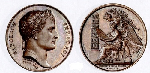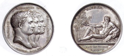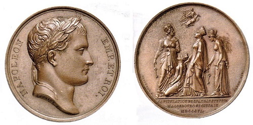 Mit jener preußischen Niederlage im Herbst 1806 war für Preußen der Krieg gegen Frankreich nicht beendet, das gelang erst durch den Frieden von Tilsit im Juli 1807, durch den Preußen große Territorien und Landsleute verlor und riesige Kontributionszahlungen an das siegreiche Frankreich entrichten musste. Versteht sich, dass der siegreiche Kaiser Napoleon I. seine militärischen und politischen Erfolge und die vielen Eroberungen durch Medaillen feiern ließ. Stets ist er es, der über andere triumphiert und bestimmt, wie sie sich ihm unterzuordnen haben. Der General, Erste Konsul und Kaiser war wie schon einer seiner Vorgänger auf dem französischen Thron, König Ludwig XIV., von Medaillen fasziniert. Er kannte ihre Wirkungen und förderte daher die "Histoire métallique", also die auf geprägtem Metall dargestellte Geschichte. Schon vor seiner Krönung nahm Napoleon Bonaparte auf Bilder und Inschriften Einfluß und verwarf auch Vorlagen, die nicht seinen Vorstellungen entsprachen. Ihm stand als Rat- und Stichwortgeber in Kunst- und Medaillenfragen Baron Dominique-Vivant Denon zur Seite, ein Mann, der als Direktor des Musée Napoléon aus französisch besetzten Ländern zielgerichtet und skrupellos bedeutende Kunstwerke nach Paris entführen ließ. Der ehemalige königliche Kammerherr und Diplomat Denon war überzeugt, dass Medaillen "die einzigen Zeugnisse des Ruhms (sind), die alle Jahrhunderte überdauern". Seine Signatur DENON DIR. (Denon direxit) unterstreicht seine Rolle als führender Kopf und Inspirator der Medaillenfolge, während die ausführenden Stempelschneider wie Andrieu, Brandt, Brenet, Droz, Galle, Gayrard, Jaley und Jeuffroy mit ihrem Namen und dem Zusatz F. (fecit) als ausführende Künstler ausgewiesen sind.