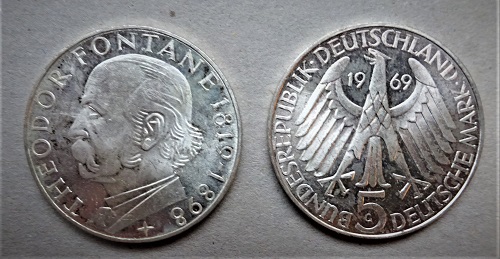 Zum 150. Geburtstag widmete die Bundesrepublik dem Dichter Theodor Fontane eine silberne Gedenkmünze zu fünf DM. Von Heinrich Körner gestaltet, war sie innerhalb der 1952 aufgelegten Serie die elfte Ausgabe zur Erinnerung an große Deutsche und wichtige Ereignisse unserer Geschichte.