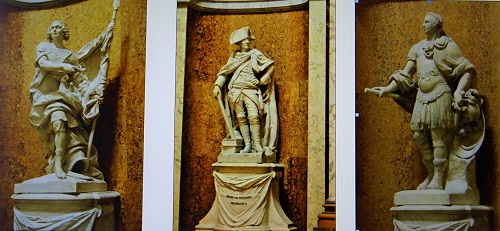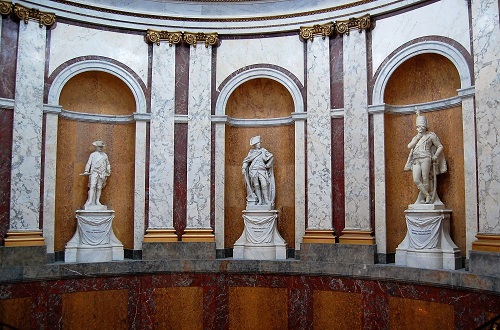 Friedrich der Große hielt es nach dem Siebenjährigen Krieg (1756 bis 1763) geboten, einigen seiner besten Feldherren Denkmäler zu setzen. Für sich selbst hat er eine solche Ehrung abgelehnt. Bis 1828 standen die Skulpturen aus Marmor auf dem Berliner Wilhelmplatz an der Wilhelmstraße. Aufgestellt wurden folgende "Bildsäulen", wie man damals sagte: 1769 Generalfeldmarschall Graf Kurt Christoph von Schwerin (begonnen von François Gaspard Adam, vollendet von Francois Sigisbert Michel); 1777 Generalleutnant Hans Karl von Winterfeldt (von Johann David Räntz d. J. und Johann Lorenz Räntz); 1781 General Wilhelm von Seydlitz (von Jean-Pierre Antoine Tassaert); 1794 General der Kavallerie Hans Joachim von Zieten (von Johann Gottfried Schadow) sowie 1828 Fürst Leopold von Anhalt-Dessau, besser bekannt als der "Alte Dessauer". Dieses Denkmal wurde 1800 von Schadow geschaffen und stand ursprünglich im Lustgarten. Die in der Kleinen Kuppelhalle aufgestellte Friedrich-Figur ist eine Marmorkopie von Franz Tübbecke nach dem im Jahre 1803 ebenfalls von Schadow geschaffenen Marmororiginal, das in Stettin steht und vor einigen Jahren als sorgsam restaurierte Leihgabe von dort in der Kleinen Kuppelhalle zu sehen war. Eine Bronzekopie des als Landesherr und Gesetzgeber aufgefassten Königs steht im Garten des Schlosses Charlottenburg.