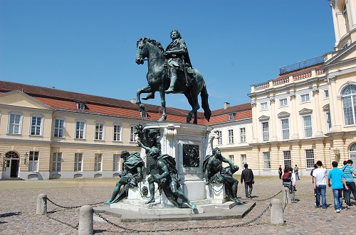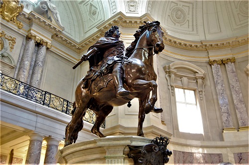 Mit ihnen wurde auch ihr in der Mitte stehender Oberster Befehlshaber, König Friedrich II., der Große, auf den angestammten Platz gestellt. Beim Gang durch das Museum kann man das einzigartige Ensemble, zu dem auch die aus dem Park von Sanssouci stammenden Gartenfiguren Venus und Merkur des französischen Bildhauers Pigalle aus dem 18. Jahrhundert gehören, in seiner ganzen Pracht bestaunen. In der Großen Kuppelhalle des Museums, dem feierlichen Entree des Museums, hatte Bode in Abstimmung mit Kaiser Wilhelm II. und dem Architekten Ernst von Ihne eine Kopie des von Andreas Schlüter geschaffenen Reiterdenkmals des Großen Kurfürsten Friedrich Wilhelm als Reverenz an einen bedeutsamen Kunstförderer des 17. Jahrhunderts aufstellen lassen. Dies geschah auf dem originalen Marmorsockel aus dem Jahr 1703, während das Postament, auf dem der Kurfürst heute im Ehrenhof des Schlosses Charlottenburg reitet, eine Nachbildung ist.