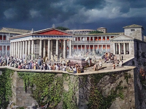 Pergamon war im 3. und 2. Jahrhundert vor Christus die Metropole eines mächtigen Reiches, das große Teile der heutigen Türkei umfasste. Die Könige aus der Dynastie der Attaliden hatten den Ehrgeiz, Pergamon, das heutige Bergama, zu einem zweiten Athen zu machen. Mit ihren prächtigen Heiligtümern und Tempeln, den Säulenhallen und Arenen, Siegesmonumenten, einem Markt und anderen Brennpunkten eines geradezu überschäumenden Kultur- und Wirtschaftslebens konkurrierte die Stadt mit Athen, dem damals vielgerühmten Machtzentrum der antiken Welt. Die besten Bildhauer ihrer Zeit waren den Königen von Pergamon zu Diensten. Diese überließen ihr Reich den Römern, die nach einer Phase der Stagnation Pergamon, der neuen Hauptstadt der Provinz Asia, zu dem auf dem Panoramagemälde in üppigen Farben gemalten Glanz verhalfen.