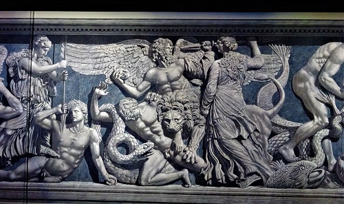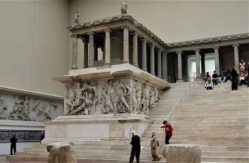 Die von Humann und weiteren Spezialisten freigelegten Funde von Pergamon gehören zu einem Siegesmonument, das der pergamenische Königs Eumenes II. (197-159 vor Christus) zur Erinnerung an seinen Kampf gegen die Galather errichten ließ. Dargestellt ist in dramatischen Szenen das Ringen der Götter und mit furchterregenden Giganten und Ungeheuern. Solche Szenen, die die Auseinandersetzungen zwischen Göttern und Menschen um die Herrschaft auf der Erde symbolisieren, waren im alten Griechenland beliebt. Im Zweiten Weltkrieg wurde der Götter- und Gigantenfries sicherheitshalber abgebaut und eingelagert. Die Rote Armee nahm ihn als "Beutekunst" in die Sowjetunion mit. 1958 wurden die Kisten unter dem Motto "Der Menschheit bewahrt" an die DDR zurückgegeben. Man hatte damals keine Zeit, den Zustand des in Einzelstücke zerlegten Bildwerks zu prüfen und zu restaurieren. Weil man das nach den Kriegsschäden notdürftig reparierte Pergamonmuseum und den Altar 1959 zum zehnten Jahrestag der Gründung der DDR unbedingt der Öffentlichkeit präsentieren wollte, wurden die Platten an grau gestrichene Betonwänden befestigt. Erst die Vereinigung der Staatlichen Museen zu Berlin West und Ost (1990) ermöglichte eine umfassende Bestandsaufnahme der Schäden sowie die Reinigung und Konservierung des empfindlichen Kunstwerks, das eindeutig "der" Besuchermagnet auf der Berliner Museumsinsel war und hoffentlich bald nach Ende der langwierigen und teuren Umbau- und Sanierungsarbeiten im Pergamonmuseum wieder sein wird.