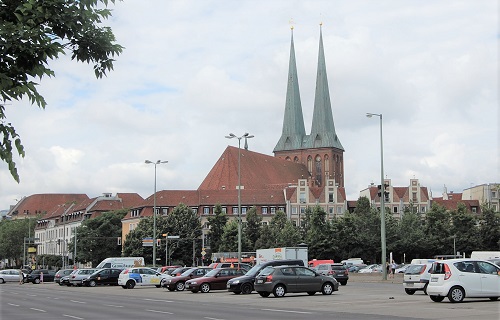 Das zur Siebenhundertfünfzigjahrfeier Berlins 1987 komplettierte und als Museum genutzte Gotteshaus mit den auffälligen Spitztürmen ist umgeben von neuen, mittelalterlich anmutenden Giebelhäusern.