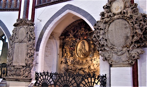 In der Nikolaikirche haben wertvolle Grabmäler aus der Barockzeit den Krieg überstanden, so die prächtige, 1725 von Johann Georg Glume geschaffene Grabkapelle für den Minister Johann Andreas von Krautt und rechts das edel dekorierte Epitaph eines weitern preußischen Höflings.