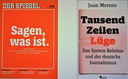 Mit wachsender Spannung las ich das mir von Angelika geschenkte Buch über den Artikelfälscher Claas Relotius. Juan Moreno hat eine wichtige und notwendige Abrechnung auch mit dem SPIEGEL verfasst, in dem ein Journalist wie der so nette, bescheidene, vielfach preisgekrönte und in seinem Gesellschaftsressort geradezu vergötterte Claas einen rasanten Aufstieg erlebte. Wenige Tage vor Weihnachten 2018 las die staunende Welt: "Kurz vor dem Ende seiner Karriere kommen sich Glanz und Elend im Leben des Claas Relotius einmal ganz nah. Es ist der Montag vor drei Wochen, der 3. Dezember, am Abend wird Relotius, SPIEGEL-Mitarbeiter seit sieben, SPIEGEL-Redakteur seit eineinhalb Jahren, in Berlin auf eine Bühne gerufen. Er hat nach Meinung der Jury des Deutschen Reporterpreises 2018 wieder die beste Reportage des Jahres geschrieben, über einen syrischen Jungen diesmal, der im Glauben lebt, durch einen Kinderstreich den Bürgerkrieg im Land mit ausgelöst zu haben. Die Juroren würdigen einen Text ,von beispielloser Leichtigkeit, Dichte und Relevanz, der nie offenlässt, auf welchen Quellen er basiert'", beschreibt der indirekt in den Skandal verwickelte Ullrich Fichtner im Nachrichtenmagazin das Debakel. "Aber in Wahrheit ist, was zu diesem Zeitpunkt noch niemand wissen kann, leider alles offen. Alle Quellen sind trüb. Vieles ist wohl erdacht, erfunden, gelogen. Zitate, Orte, Szenen, vermeintliche Menschen aus Fleisch und Blut. Fake. [...] Es ist alles nur ein Arrangieren von Rohmaterial, vor allem fremdes, das ist die eigentliche Methode Relotius. Er bedient sich aus Bildern, aus Facebook-Posts, YouTube-Videos, er fleddert alte Zeitungen, entlegene Blogs, und aus den Teilen und Splittern und Fetzen und Krümeln erschafft er seine Kreaturen wie ein verspielter kleiner Gott. Chris Jaeger, Gayle Gladdis, Neil Becker aus Fergus Falls, Nadim und Khalid in Kirkuk, Ahmed und Alin aus Aleppo, Mohammed Bwasir aus Guantanamo, sie sind keine Menschen aus Fleisch und Blut, sie leben nur auf dem Papier, und ihr Schöpfer heißt Claas Relotius. Manchmal lässt er sie singen, manchmal weinen, manchmal beten. Und wenn es ihm gefällt, wie in ,Jaegers Grenze', dann lässt er seine Hauptfigur auch einmal schießen, mit einem Sturmgewehr, mit scharfer Munition, in die Nacht hinein, einfach so, und weil es an den Schluss seines Märchens gerade so gut passte." Mit Claas Relotius verloren weitere Redakteure wie Matthias Geyer und Ullrich Fichtner ihren Job. Geyer hatte als Leiter des Gesellschaftsressorts von 2016 bis 2018 die Arbeiten von Relotius betreut und ging, verblendet wie er war, seinen Lügengeschichten auf den Leim, so wie auch berühmte Preisrichter und die vielgepriesene Dokumentationsabteilung des SPIEGEL alles billigte, was der Lügenbold ihnen vorgesetzt hatte, weil alles so schlüssig, schön und überzeugend klang.