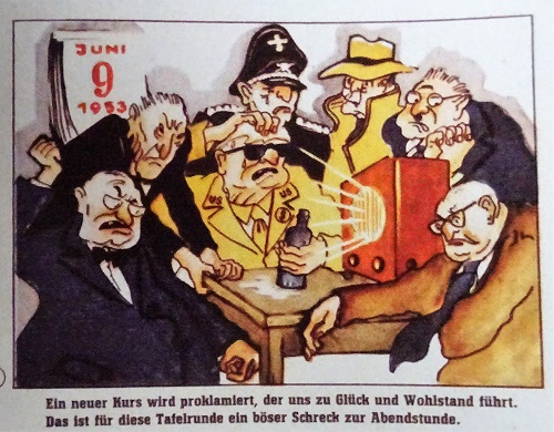 Während ostdeutsche Arbeiter von der Sowjetunion lernen, um siegen zu lernen, und ihre ganze Kraft dem Aufbau des Sozialismus widmen, ärgern sich westdeutsche Alt- und Neonazis und Imperialisten gemeinsam mit Bundeskanzler Konrad Adenauer über den Neuen Kurs der SED. Dass die Sowjets diesen den ostdeutschen Genossen quasi aufgezwungen haben, verschwieg die Propaganda.
