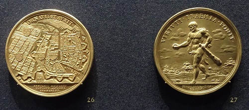 Mit seiner Sonderausstellung lädt das Münzkabinett, aus seinem reichen Fundus schöpfend, die Besucher zu einer spannenden Reise durch 400 Jahre europäischer Geschichte ein. Die von Wilhelm Hollstein und Kathleen Dittrich kuratierte Dokumentation korrespondiert mit der Dauerausstellung ein paar Schritte weiter, in der das Münzkabinett auch geprägte Stadt- und Gebäudeansichten präsentiert. Farbig markierte Beschreibungen verweisen dort auf das nebenan in den milde beleuchteten Vitrinen ausgebreitete Material. Da von den Stücken immer nur eine Seite gezeigt werden kann, besteht die Möglichkeit, sie als Fotografien beidseitig und ganz groß an einem Monitor zu betrachten und einiges über die Hintergründe zu erfahren, die zur Ausgabe des jeweiligen Stücks geführt haben.