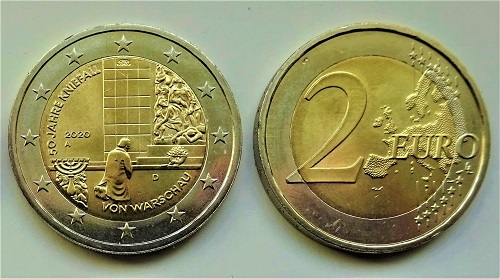 Fünfzig Jahre ist es her, dass Bundeskanzler Willy Brandt bei seinem Besuch in Warschau vor dem Mahnmal zum Gedenken an den jüdischen Ghetto-Aufstand von 1943 in die Knie gegangen ist. Das Jubiläum wird durch eine neue, von den Berliner Münzdesigner und Stempelschneider Bodo Broschat gestaltete Zweieuromünze gewürdigt. Brandt war mit einer Delegation nach Warschau zur Unterzeichnung des Vertrags zwischen der Bundesrepublik Deutschland und der Volksrepublik Polen gekommen, mit dem beide Staaten vor allem die Unverletzlichkeit der Oder-Neiße-Grenze anerkannten, was allerdings nicht wenige Westdeutsche und vor allem Heimatvertriebene als Verrat an ihren Interessen und Gefühlen ansahen. Für Polen unterschrieb der Ministerpräsident Józef Cyrankiewicz, ein Überlebender des Vernichtungslagers Auschwitz.