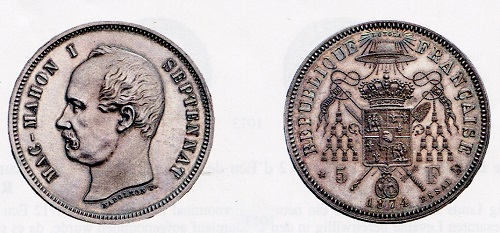 Nach dem Sturz von Kaiser Napoleon III., eines Neffen des ersten Napoleon, wurde Frankreich am 4. September 1870 erneut Republik, die nunmehr dritte. Daraufhin änderte man die Münzbilder und gab statt der Geldstücke mit dem Kopf und Wappen des gestürzten und ins Exil verbannten Monarchen solche mit Marianne-Köpfen und weiteren Motiven aus der Zeit nach 1789 heraus. Monarchisten warben während der III. Republik Probeprägungen nicht nur für Thronprätendenten aus den ehemaligen Herrscherfamilien Bourbon und Bonaparte. Eine solche Münze oder besser gesagt Medaille ehrt Marie Edme Patrice Maurice, Graf von Mac-Mahon, seit 1859 Herzog von Magenta. Der Marschall von Frankreich war als Nachfolger von Adolphe Thiers der zweite Präsident der Dritten Republik. Der Kriegsheld war ein Mann, auf den Anhänger des ehemaligen Königshauses Bourbon sowie klerikale Kreise bezüglich der Restauration der Monarchie und der Wiederherstellung des Einflusses der katholischen Kirche große Hoffnungen setzten. Sie taten das allerdings vergeblich, weil kaum jemand mehr in Frankreich einen König oder Kaiser haben wollte.