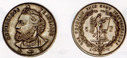 Eine andere Prägung erinnert an Léon Gambetta, der am 4. September 1870 mit Jules Favre die Dritte Republik ausgerufen hatte, ihr erster Innenminister und im Auftrag der Regierung der Nationalen Verteidigung den Krieg gegen Preußen und seine Verbündete leitete. Gambetta musste den Waffenstillstand mit dem Feind akzeptieren und ging später als entschiedener Vertreter des Revanchismus gegenüber Deutschland in die Geschichte ein. Der von ihm geprägte Satz: "Toujours y penser, jamais en parler!" ("Immer daran denken, nie davon sprechen!") ging in den internationalen Schatz der geflügelten Wörter ein. Im weitgehend monarchistisch gesinnten Parlament war er der wichtigste Vertreter der kleinen republikanischen Opposition, der Partei der "Radikalen". Zunehmend vertrat er moderatere Positionen und trug wesentlich 1877/1878 zum Sturz des Präsidenten Mac-Mahon bei.