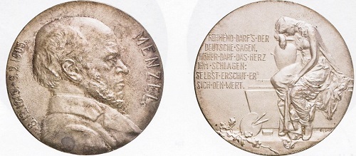 Münzen und Medaillen zu Ehren von Malern, Bildhauern, Architekten, Musikern und anderen Künstlern sind beliebte Sammelstücke. Wenn man sucht, findet man in Sammlungen und der numismatischen Literatur zahlreiche Belegstücke, die ab und zu auch vom Münzhandel angeboten werden. Darunter befindet sich eine von Reinhold Begas geschaffene Medaille, die die Königliche Akademie der Künste zu Berlin zum 80. Geburtstag ihres berühmten Mitglieds herausgab. Auch hier wird das Bildnis des Jubilars mit einer Allegorie verbunden. Sie besteht aus einer Eule, die auf einem ionischen Kapitell sitzt und Malerutensilien und einen Lorbeerzweig bewacht. Die Bundesrepublik Deutschland und bis 1990 die DDR haben keine Gelegenheit ausgelassen, um große Künstler durch Gedenkmünzen zu ehren. Als 1980 die DDR eine Fünf-Mark-Münze zu Menzels 75. Todestag heraus brachte, bildete der Gestalter Gerhard Rommel den Charakterkopf des Mannes ab, dem wir das "Flötenkonzert", die "Tafelrunde Friedrichs des Großen", das "Eisenwalzwerk" sowie unzählige Grafiken und Zeichnungen verdanken.