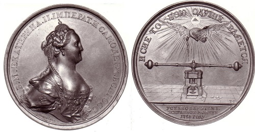 Auf einer Medaille von T. Iwanow aus dem Jahre 1763 kreist der kaiserliche Adler über der Spindelpresse, darüber ist im Dreieck das göttliche Auge zu sehen. Auf der Vorderseite ist die Zarin Katharina II., die Große, abgebildet, die aus dem kleinen deutschen Fürstentum Anhalt-Zerbst stammte und nach der Ermordung ihres Gemahls, des Zaren Peter III., wie ihr Vorbild Peter I. versuchte, ihr Reich dem Westen zu öffnen und umfangreiche Reformen durchzusetzen. 1768 ließ die Kaiserin eine Medaille zum Gedenken an den Präsidenten des Bergkollegiums, I. W. Schlatter, prägen. Die mit dem Bildnis des Geheimen Rats versehene Medaille, eine Arbeit von J. G. Waechter und J. B. Gass, zeigt rückseitig eine Frau an einem Tisch sitzend. Rechts davon steht ein Schmelzofen, im Hintergrund schaut der Arm einer Spindelpresse hervor. Die lateinische Inschrift würdigt Schlatter als einen Mann, der die russischen Münzverhältnisse verbessert hat.
