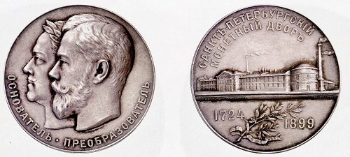Bliebe zu sagen, dass 1924 der 200. Geburtstag der Petersburger Münze mit einer eindrucksvollen Medaille gewürdigt wurde, welche die Fortschritte in der Geldfabrikation verdeutlicht. Auf der Vorderseite sind zwei von einem Soldaten bewachte Münzarbeiter mit der Hammerprägung beschäftigt, wie sie zur Zeit Peters des Großen vielfach noch üblich war. Um die Hände vor dem Schlag zu schützen, wird der Oberstempel von einer Zange festgehalten. Auf der Rückseite der sehr seltenen Medaille von S. Martynow sind Arbeiter an Uhlhorn' schen Kniehebelpressen zu sehen, damals das Beste auf dem Gebiet der Prägemaschinen vor Erfindung computergesteuerter Automaten. Neben diesen Medaillen mit Münzmaschinen und Münzarbeitern gibt es weitere russische beziehungsweise sowjetische Medaillen und Plaketten, die den Münzhof in Sankt Petersburg beziehungsweise Leningrad als Fabrik mit rauchenden Schloten abbilden.