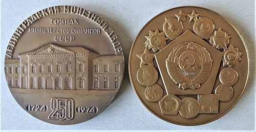 Zu ihrem 250. Gründungsjubiläum 1974 brachte die Leningrader Münze mehrere Medaillen heraus. Immer wiederkehrend sind die Ansichten des Hauptgebäudes mit dem sowjetischen Staatswappen im dreieckigen Giebel, unterschiedlich dagegen die Rückseitenmotive mit Orden, Medaillen und Münzen. Ganz klein eingeprägt das Signet der Fabrik LMD, das auch auf einem am Band tragbaren Treuezeichen für langjährige Mitarbeit erscheint. Abweichend davon kam im gleichen Jahr eine Medaille heraus, die die Arbeit der Graveure würdigt. Mit einem Stichel wird in römischen Zahlen die Ziffer 250 in einen Stempel geschnitten. Technisch interessant ist diese mit A. Schagin signierte Medaille durch die vertieften Inschriften, denn üblicherweise erscheinen Buchstaben und Zahlen erhaben. Wenn man die ab 1703 in Sankt Petersburg geprägten Medaillen nebeneinander, dann kommt eine bedeutsame, wegen der vielen Raritäten allerdings auch teure Sammlung zusammen.