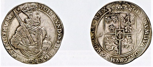 Es ist nicht ungewöhnlich, dass auf alten Münzen unterschiedliche Titel der jeweiligen Herrscher erwähnt werden. Ein in Stockholm geprägter Taler von 1597 ist mit dem gepanzerten Hüftbild von König Sigismund III. von Polen geschmückt, der auch König von Schweden war. Als Sohn des schwedischen Königs Johann III. und seiner Gemahlin Katharina Jagiellonka, einer Schwester des polnischen Königs Sigismund II. August, gehörte er sowohl den Wasa als auch zu den Jagiellonen an. Sigismund III. war ab 1587 König von Polen und Großfürst von Litauen, von 1592 bis zu seiner Absetzung durch den schwedischen Reichstag 1599 König von Schweden und von da ab bis zu seinem Tode 1632 nur noch Titularkönig von Schweden. Die Verwendung solcher Titel unterstich wahre Machtverhältnisse oder nur Ansprüche auf fremde Kronen und Ländereien. Diesen Brauch kann man auch auf Münzen und Medaillen anderer Herrscherhäuser beobachten. So erhoben englische Könige lange Zeit Ansprüche auf französische Territorien und haben dies durch entsprechende Aufschriften kundgetan.