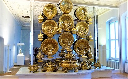 Nach den Befreiungskriegen von 1813 bis 1815, aus denen Preußen siegreich und als Großmacht hervor ging, fielen die Lücken auf der königlichen Tafel unangenehm auf, und so wurden große Anstrengungen unternommen, um neue Silberservices anzufertigen, wofür die Ausstellung schönen Anschauungsunterricht bietet. In anderen Vitrinen werden Tafelaufsätze und Geschirren aus kostbarem Porzellan gezeigt. Die figürlichen Aufsätze und vielteiligen Services, die Friedrich der Große und andere Monarchen bei der 1763 gegründeten Königlichen Porzellanmanufaktur Berlin in Auftrag gaben, waren ausgesprochene Luxusgegenstände und wurden wegen ihrer Exklusivität der Silberkammer zugeordnet . Dort waren Diener den ganzen Tag nur damit beschäftigt, das Tafelsilber und Porzellan sauber zu halten, und wenn mal etwas entzwei ging, neue Stücke nachzubestellen. Alte Bilder vom kaiserlichen Hof in Berlin und Potsdam schildern, wie man dort aufwändig gespeist hat und von zahllosen Lakaien bedient wurde. Speisekarten vermerkten, was mit Rücksicht auf den Geschmack der gereichten Speisen mal auf Silber und mal auf Porzellan serviert wurde. Um Hochzeiten, Taufen und anderen Festlichkeiten zusätzlichen Glanz zu geben, hat man meterhohe Aufsätze auf Tische und Buffets getürmt und dieses Schauspiel auch in den Medien publiziert.