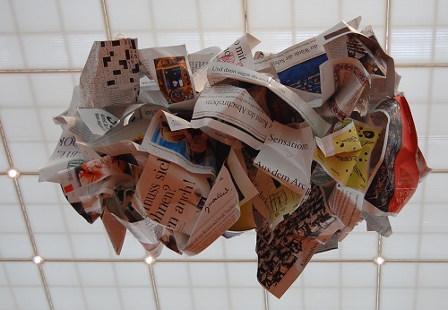 Olaf Metzel hatte Aluminiumplatten beidseitig mit 120 Texten aus Zeitungen und Büchern sowie Ansichten von Einbänden und Comics bedrucken lassen. Hinzu kamen ein Kreuzworträtsel sowie Fotos von historischen Lampen und anderen Gegenständen, die alle exemplarisch für das Zeitalter des Gedruckten stehen. Die Platten wurden zu einem Knäuel von 4,50 mal 7,30 mal 5,20 Metern verformt und unter der Decke des von HG Merz als Glaskubus ausgeführten Lesesaals gehängt. Text und Bilder sind in dem Buch "Der neue Lesesaal der Staatsbibliothek zu Berlin" veröffentlicht (Nicolai Verlag Berlin, 19,90 Euro, ISBN 978-3-89479-778-2).