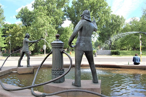 Wenn auf jemand die Charakterisierung "Helden ohne Degen" zutrifft, dann sind es die Leute von der Feuerwehr. Sie sind die ersten, die zu einem Brand, zu einem Verkehrsunfall oder zu einem schwer erkrankten Menschen gerufen werden, bei dessen Rettung Sekunden und Minuten entscheidend sind. Der Feuerwehrbrunnen an der Waldemarstraße am Südrand des Mariannenplatzes im Bezirk Kreuzberg schildert nur einen Teil der Arbeit - das Löschen eines Brandes. Drei tapfere Männer in den Uniformen der preußischen Feuerwehr sind bei Löscharbeiten dargestellt, der Hauptmann in der Mitte steht mit erhobener Hand an einem Hydranten, seine Kollegen halten die Spritzen in das Becken. Der Bildhauer Kurt Mühlenhaupt fasst die Szene humorvoll auf, hat den Feuerwehrleuten gar dicke Nasen verpasst, angeblich damit sie das Feuer frühzeitig riechen. Wenn der Brunnen angestellt ist, spritzt Wasser durch die Schläuche aus Bronze in hohem Bogen in das Becken. Beim Anblick der bronzenen Männer muss man sich hinzu denken, dass die Entwicklung in den vergangenen 150 Jahren rasant vorangegangen ist und Feuerwehrmänner heute einen Allround-Beruf ausüben, der ihnen großen Respekt in der Bevölkerung sichert.