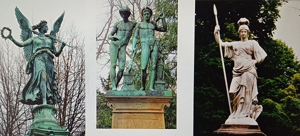 Schaut man genau hin, dann sieht man, dass die vor mehreren Jahren wegen der Dachsanierung abgenommenen Figuren nicht aus der Barockzeit stammen, sondern Neuschöpfungen aus der 1970er Jahren sind. Sie sollten die lange Nordfassade des Schlosses leicht und lebendig nach oben ausklingen lassen. Die Figuren bestehen nicht aus Sandstein wie üblich, sondern aus gegossenem Aluminium, das mit einer hellen Steinfarbe bestrichen ist und daher von weitem aussieht, als seien sie aus Marmor. Als Bildhauer zeichnen Günter Anlauf, Karl Bobek, Joachim Dunkel und Harald Haacke für die Gestaltung der Figuren verantwortlich, die Malerei, Bildhauerei, Architektur und andere Künste sowie die Wissenschaften, aber auch die Musen und ihren Anführer, den antiken Gott Apoll, feiern.