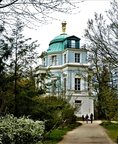 Das etwas versteckt im hinteren Teil des Schlossparks und nahe der Spree gelegene Belvedere war ursprünglich ein Teehaus, Aussichtsturm und Musiksalon. Erbaut 1788/9 nach Plänen von Carl Gotthard Langhans, dem wir auch das Brandenburger Tor verdanken, für König Friedrich Wilhelm II., wurde das von diesem auch für seine musikalischen Ambitionen genutzte Gebäude nach erheblichen Zerstörungen im Zweiten Weltkrieg in den 1950er Jahren nach alten Bauplänen und Illustrationen rekonstruiert. Das Innere der drei übereinander liegenden Säle konnte nicht mehr analog zum ursprünglichen Zustand rekonstruiert werden. Als Dauerleihgabe des Landes Berlin werden im Belvedere Meisterwerke aus der Königlichen Porzellan-Manufaktur Berlin (KPM) gezeigt.