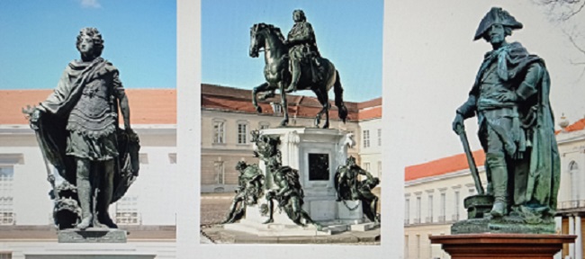 Wenige Schritte weiter steht ebenfalls vor dem Neuen Flügel des Charlottenburger Schlosses ein Nachguss des von Johann Gottfried Schadow geschaffenen Denkmals Friedrichs des Großen in Stettin. Minister Graf von Hertzberg hatte den Bildhauer beauftragt, eine Marmorstatue des Königs in "dem militairischen Costum worin man ihn immer sah" zu schaffen. Von dem 1793 in Stettin enthüllten Denkmal war Schadow wenig angetan. Rückblickend schrieb er, man habe den König lieber ohne den Hermelinmantel gesehen, "was in kleiner Dimension auch genügend geraten kam. Hier in kolossaler Größe besorgte ich (hatte ich Sorge, H. C.), dass das Ganze ein dürftiges Aussehen erhalten würde. Wie in Wirklichkeit die Uniform mit dem Hut auf dem Kopfe und einem Königsmantel unverträglich erscheinen würde, so hier. Auch zähle ich diese Arbeit nicht zu den gelungenen; die Drapirung des Mantels war ein mühseliges Unternehmen". Schadow zeigt den König als Landesherrn, Feldherrn und Gesetzgeber. "Mit dem Feldmarschallstabe, welcher er auf die Gesetzbücher stützt, ist die Weisheit und Gerechtigkeit seiner Befehle angedeutet", notierte der Bildhauer. Aber man kann das Denkmal auch als Dominanz des Militärischen, angedeutet durch den Feldherrenstab, über dem Gesetz, verkörpert durch die Folianten zu Füßen des Königs. Das Stettiner Original galt nach dem Zweiten Weltkrieg als verloren, wurde vor fast zehn Jahren restauriert und als Leihgabe des Stettiner Nationalmuseums im Berliner Bode-Museum gezeigt.