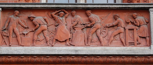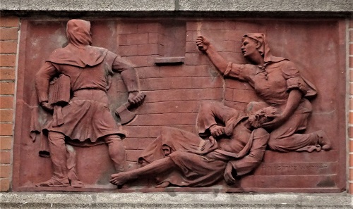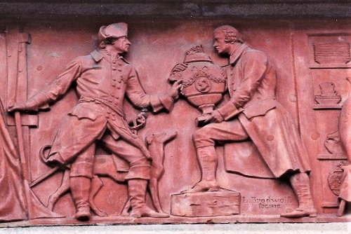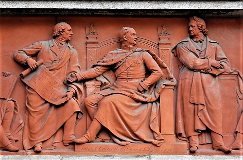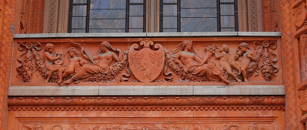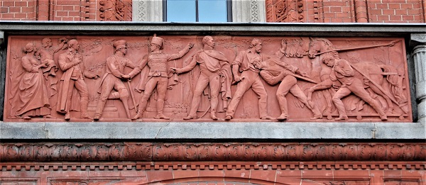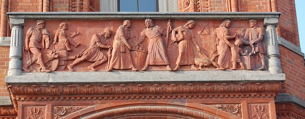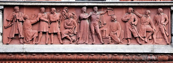 Dass Skulpturen und Inschriften an öffentlichen Gebäuden an Bauherren und historische Ereignisse hinweisen, ist nichts Ungewöhnliches. In Berlin findet man auf Schritt und Tritt solche Bilder und Widmungen, mit denen die Bauwerke gleichsam geadelt wurden. Auch der aus 36 Tafeln bestehende Bilderfries aus roten Terrakottaplatten rund um das Rote Rathaus wurde 1876 bis 1879 in spätklassizistischen Formen als eine Art steinerne Chronik angebracht. Dargestellt sind Episoden von der Frühzeit der Stadt bis zur Reichsgründung im Jahre 1871. Auf den von den Bildhauern Ludwig Brodwolf, Alexander Calandrelli, Otto Geyer und Rudolf Schweinitz gestalteten Reliefs in den Maßen sechs mal ein Meter erscheinen Bürger, Handwerker, Ritter, Fürsten, Soldaten, Gelehrte, Künstler und viele andere Personen. In der Regel sind es Männer, die hier posieren, Frauen spielen als Staffage eine untergeordnete Rolle, weil man ihnen nur eine dienende und duldende Rolle zubilligte. Eine Ausnahme bilden die beiden Königinnen Sophie Charlotte und Luise, die im frühen 18. und 19. Jahrhundert neben ihren Männern agieren und eine gute Figur machen.