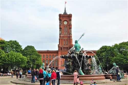 Um das Rote Rathaus in der Mitte Berlins zieht sich ein Bilderfries, auf dem Stationen der Stadtgeschichte dargestellt sind. Die Terrakottaplatten sind wie ein aufgeschlagenes Geschichtsbuch gestaltet, doch kann man nicht alles für bare Münze nehmen, denn die "Steinerne Chronik" ist ein Spiegelbild ihrer Entstehungszeit nach 1871. Offiziell heißt der Sitz des Regierenden Bürgermeisters und des Senats Berliner Rathaus, doch hat sich der volkstümliche Name "Rotes Rathaus" für das riesige Verwaltungsgebäude mit dem hohen Uhrenturm eingebürgert. Er bezieht sich nicht auf die Politik, die dort zurzeit von der rot-roten Koalition aus SPD und PDS gemacht wird, sondern auf die dunkelrote Farbe des für den Bau verwendeten und im 19. Jahrhundert beliebten unverputzten Backsteins, der überall in der Stadt an Kirchen, Schulen, Fabriken und anderen Bauten vertreten ist. Schon bald nach seiner Fertigstellung erwies sich das Rote Rathaus als zu klein, weshalb um 1900 in der Nähe das Stadthaus ebenfalls mit einem mächtigen, Turm errichtet wurde.