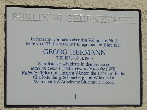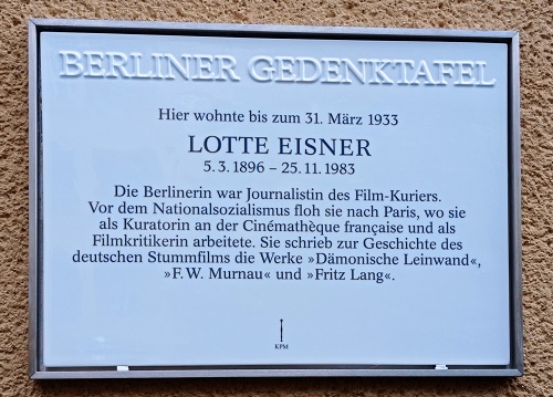 Zu ihrem 125. Geburtstag wurde im März 2021 Lotte Eisner, die bedeutende Filmjournalistin und Sammlungskuratorin der Cinémathèque française, mit einer Gedenktafel aus Porzellan an ihrem letzten Wohnort in der Marbacher Straße 18 in Berliner Bezirk Charlottenburg-Wilmersdorf geehrt. Sie flüchtete von hier aus vor den Nationalsozialisten nach Paris. Sie gilt als bedeutende Chronistin des deutschen Stummfilms. In Berlin geboren, wuchs Lotte Eisner in einem wohlhabenden jüdischen, kulturinteressierten Milieu auf, studierte Kunstgeschichte und wurde 1924 promoviert. In Berlin schrieb sie Kultur- und Theaterkritiken, ab 1927 arbeitete sie für die Zeitschrift "Film-Kurier".