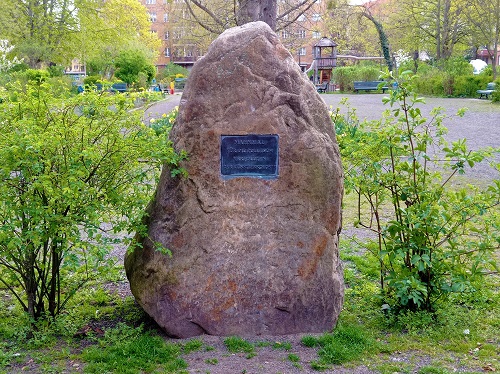 Ende der 1950er Jahre hat man den von vier- bis fünfgeschossigen Häusern mit dunkelroten Klinkerfassaden flankierten Platz neu gestaltet und ihm Rasenflächen, Blumenrabatten und Kinderspielecken geschenkt. Auf dem Platz steht gegenüber der Einmündung zur Bonner Straße ein Findling, der 1988 enthüllt wurde. Die kleine Bronzetafel erinnert an die "politisch Verfolgten der Künstler-Kolonie" und meint damit vor allem linksorientierte Bewohner des Viertels, die nach der Errichtung der NS-Diktatur am 30. Januar 1933 von den Nazis mit Arbeitsverbot belegt, ins Exil gedrängt, in die Konzentrationslager verschleppt und ermordet wurden.