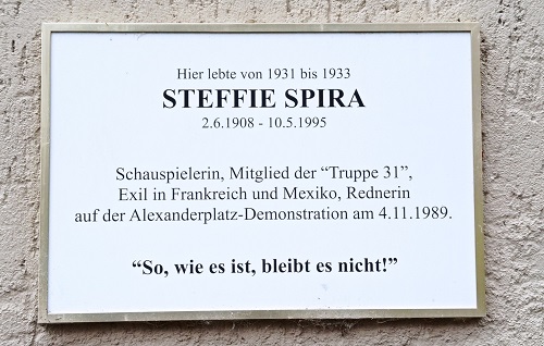 Aus dem Rahmen fällt eine Tafel für Helene Jacobs, die verfolgte Juden bei sich versteckt hat. Ebenfalls mit einer Gedenktafel wird die Schauspielerin Steffie Spira geehrt, die am 4. November 1989 in die Geschichte einging, als sie fünf Tage vor dem Fall der Mauer auf dem Berliner Alexanderplatz in einer Rede vor rund einer halben Million Menschen die Arroganz der SED-Führung angriff und sich für ihre Urenkel wünschte, "dass sie aufwachsen ohne Fahnenappell, ohne Staatsbürgerkunde und dass keine Blauhemden mit Fackeln an den hohen Leuten vorübergehen!" Das Motto der Tafel "So wie es ist, bleibt es nicht!" ist dem Gedicht "Lob der Dialektik" von Bertolt Brecht entnommen, in dem es heißt: "Wer noch lebt, sage nicht: niemals! / Das Sichere ist nicht sicher. / So, wie es ist, bleibt es nicht. / Wenn die Herrschenden gesprochen haben, / Werden die Beherrschten sprechen."