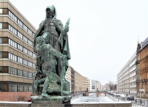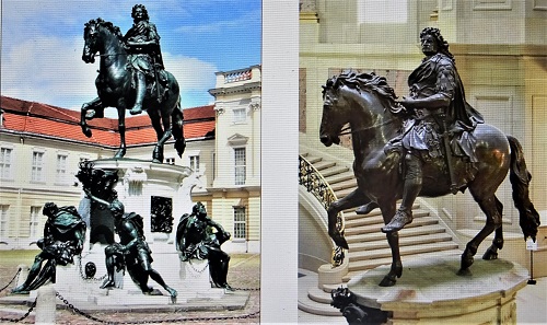 Andreas Schlüters berühmtes Denkmal des Großen Kurfürsten Friedrich Wilhelm von Brandenburg begegnet uns in Berlin mehrfach - im Ehrenhof des Charlottenburger Schlosses, eine Kopie auf originalem Marmorsockel füllt die Große Kuppelhalle des 1904 eröffneten Kaiser-Friedrich-Museums, des heutigen Bode-Museums. Außerdem gibt es im Märkischen Museum einen verkleinerten Abguss, und auf einer Terrakottaplatte an der Fassade des Roten Rathauses ist zu erkennen, wie der Bildhauer Friedrich I., dem Sohn und Nachfolger des bedeutenden Hohenzollern, das Modell präsentiert.