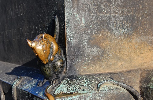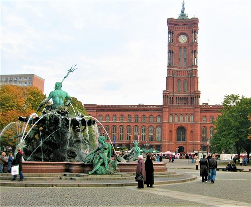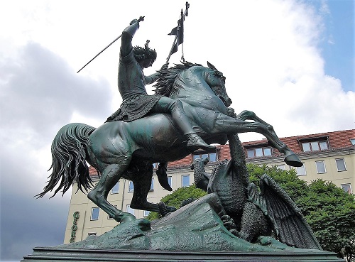 Dass die Heilige Gertraude an einem anderen Ort in der Nähe neu aufgestellt werden soll, ist nicht ungewöhnlich. Wenn wir uns in der Umgebung umschauen, dann sehen wir weitere Skulpturen wie den Heiligen Georg als Drachentöter im Nikolaiviertel und den Neptunbrunnen vor dem Roten Rathaus, die ursprünglich woanders standen. Im Nikolaiviertel, einer Mischung von Neubauten und kopierten Altberliner Häusern aus der Spätzeit der DDR, bekam der Heilige Georg, der in einem der Höfe des Stadtschlosses den Zweiten Weltkrieg überstanden hatte, 1987 einen neuen Platz. Georg war wegen seines standhaften Glaubens um das Jahr 303 unter dem römischen Kaiser Diocletian gefoltert und enthauptet worden. Nach der Legende soll er eine schöne Königstochter aus den Klauen eines gräulichen Drachen gerettet haben. Fortan wurde der später heilig gesprochene Held stets mit einem sich windenden Lindwurm gezeigt. Heute ist es, als reite er von der Spree, den Drachen niederstreckend, auf die Nikolaikirche zu. Der Bildhauer August Kiss war noch nicht lange unter der Erde, als seine Witwe 1865 das eindrucksvolle Bildwerk dem preußischen König Wilhelm I., ab 1871 Kaiser Wilhelm I., schenkte. Der Monarch wies dem Blutzeugen christlichen Glaubens einen würdigen Platz in einem der beiden Höfe des Berliner Schlosses an. Nachdem der Bau 1950 auf Befehl des SED-Chefs Walter Ulbricht gesprengt und abgetragen worden war, erhielt der Nothelfer auf hohem Granitsockel einen neuen Platz im Volkspark Friedrichshain. Die ungünstige Aufstellung an einem kleinen Teich unter hängenden Weiden ließ von der Würde und Ausstrahlung des Bildwerks wenig übrig. August Kiss hatte die monumentale Gruppe ohne offiziellen Auftrag geschaffen. Die finanzielle Lage des kinderlosen Ehepaares war so günstig, dass sich der Meister ohne Einschränkung mit der Modellierung des Drachentöters befassen konnte. Die Berliner Nationalgalerie verdankt Kiß und seiner Frau eine beträchtliche Stiftung, die für den Ankauf zeitgenössischer Kunstwerke bestimmt war.