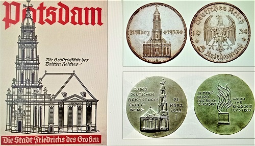 Münzsammlern ist das Gotteshaus mit seinem 88 Meter hohen Turm vor allem durch silberne Zwei- und Fünfmarkstücke bekannt, die 1934 zur Erinnerung an den berühmt-berüchtigten "Tag von Potsdam" am 21. März 1933 geprägt wurden. Damit wurde in der NS-Zeit jener Tag bezeichnet, an dem in einem feierlichen, durch den Reichsrundfunk in alle Himmelsrichtungen übertragenen Staatsakt in der Garnisonkirche der greise Reichspräsident Paul von Hindenburg symbolisch die exekutive Gewalt in die Hände des von ihm bereits am 30. Januar 1933 zum Reichskanzler ernannten Führers der NSDAP Adolf Hitler übertrug. Der vom Propagandaminister Joseph Goebbels vorbereitete und breit in allen Medien ausgeschlachtete Handschlag zwischen beiden Männern fand auch im Ausland große, meist positive Aufmerksamkeit. An der Bahre des großen unsterblichen Friedrich beginne das neue Werk des Wiederaufbaues, versprach Hitler bei dem Staatsakt und meinte die unbarmherzige Verfolgung jedweder Opposition und die Errichtung seines ganz auf Diktatur und Unterdrückung ausgerichteten Führerstaates. Propagandaminister Joseph Goebbels fand in seinem Tagebucheintrag vom 22. März 1933 pathetische Worte: "Ein geschichtlicher Augenblick. Das Schild der deutschen Ehre ist wieder reingewaschen. Die Standarten mit unseren Adlern steigen hoch."