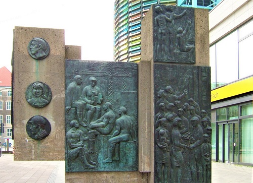 Berlin war am Ende des zweiten Weltkriegs eine riesige Trümmerlandschaft. Fast alle Häuser in der Innenstadt und angrenzenden Bezirken waren zerstört, schwer beschädigt und unbewohnbar. Nur Randgebiete waren von Bombentreffern und Artilleriebeschuss verschont geblieben. Als erstes mussten die riesigen Trümmermassen beseitigt werden. Noch heute markieren Hügel im Friedrichshain und anderenorts, wo man die Steine abgekippt hat, wenn man sie nicht geputzt und für Neubauten und zum Reparieren der beschädigten Häuser benutzt hat. Vor dem Roten Rathaus erinnern die Bronzefiguren einer Trümmerfrau und eines Aufbauhelfers, geschaffen von Fritz Cremer, der auch das Denkmal für die Interbrigadisten im Friedrichshain und das Buchenwalddenkmal geschaffen hat, an die schweren Jahre des Neubeginns nach dem Zweiten Weltkrieg, an die Leistungen der Berliner beim Wiederaufbau ihrer so furchtbar geschundenen Stadt. Die 1958 unter der lapidaren Bezeichnung "Weg mit den Trümmern I und II" aufgestellten Plastiken zeigen eine junge Frau mit geschulterter Schaufel und einen Mann, der eine Spitzhacke in der Hand hält und sich einen Ärmel hochkrempelt. Selbstbewusst blicken die beiden hinüber zum Sitz des Regierenden Bürgermeisters. Jahrelang waren die Skulpturen verschwunden, weil auf dem Gelände ober- und unterirdisch die U-Bahn 55 von Hönow zum Hauptbahnhof gebaut wurde.