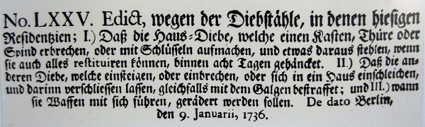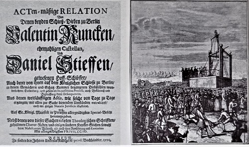Wer sich an kurfürstlichem oder königlichem Eigentum vergriff, war des Todes, da kannten die Hohenzollern kein Erbarmen. Besonders grausam wurden 1718 die Berliner Schlossdiebe Valentin Runck und Daniel Stieff bestraft, die ihre Stellung am preußischen Hof schamlos zur eigenen Bereicherung ausgenutzt hatten. Schlosskastellan Runck und der Hofschlosser Stieff hatten Zugang zum königlichen Schatz und anderen im Berliner Schloss aufbewahrten Preziosen, in einem Gebäude, das als Humboldt-Forum wieder aufgebaut ist und als Museum und Kulturstandort genutzt wird. Ungeniert bedienten sich die Bediensteten an goldenen und silbernen Kostbarkeiten und verkauften sie, unvorsichtig wie sie waren, Berliner Juwelieren und anderen Personen.