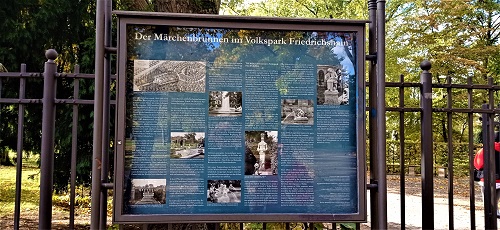 Einer der beliebtesten und am meisten fotografieren Brunnen in Berlin ist der Märchenbrunnen im Volkspark Friedrichshain. Die nach Plänen des Berliner Stadtbaurates Ludwig Hoffmann zwischen 1911 und 1913 geschaffene Anlage ist mit Skulpturen der Bildhauer Ignatius Taschner, Josef Rauch und Georg Wrba geschmückt und versinnbildlichen Märchen der Brüder Grimm. Zu erkennen sind unter anderem Rotkäppchen, der gestiefelte Kater, die sieben Raben, Dornröschen, Brüderchen und Schwesterchen und Aschenputtel. Die aus empfindlichem Kalkstein gefügte Säulenkolonnade als Rückwand des abgestuften Wasserbeckens wird von Wassertieren und Hirschen geschmückt.