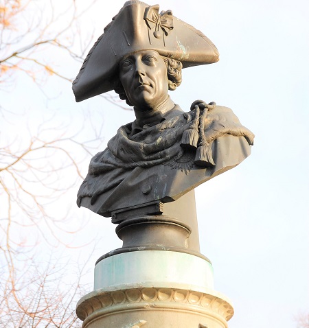 Stifter des im August 1848 aufgestellten Königdenkmals war Hofschneidermeister Freitag, der mit einer namhaften Geldspende dem Namensgeber des beliebten Ausflugsgebiets seine Reverenz erwies und sich selber ein Denkmal als königstreuer Preuße setzte. Dies war im Revolutionsjahr 1848 eine durchaus mutige Tat, war doch das Ansehen der Hohenzollern stark gesunken. Die Widmung lautet "Friedrich dem Großen. Seinen Mitbürgern, die durch Gründung dieses Hains das Andenken an den großen König unsern Nachkommen bewahren wollen, errichtet dieses Denkmals als Zeichen des Dankes der Bürger J. G. Freitag".