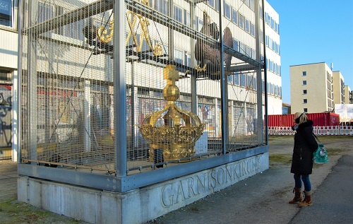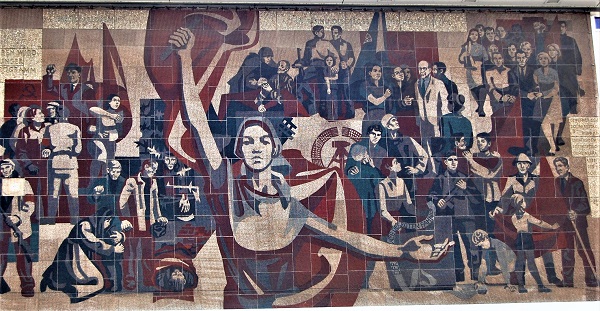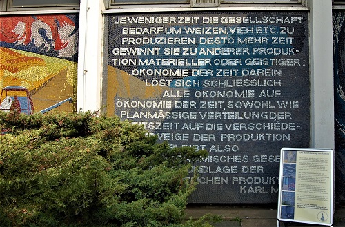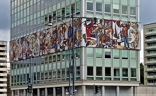 Das Mosaik "Lob des Sozialismus" am Haus des Lehrers unweit des Berliner Alexanderplatzes, die "Bauchbinde" am Pressecafé nicht weit davon entfernt und das Wandbild "Der Weg der roten Fahne" am Dresdner Kulturpalast sind charakteristische Beispiele für die von der SED betriebene Kunst- und Kulturpolitik und Propaganda im eigenen Interesse, stehen aber dennoch unter Denkmalschutz. (Fotos: Caspar)