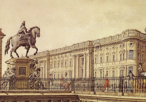 König Friedrich Wilhelm II., der 1786 seinem Onkel auf den preußischen Thron folgte, verlangte für das Berliner Denkmal ein "römisches Kostüm", das nach damaliger Auffassung noch am ehesten Überzeitlichkeit und Heldentum des Großen Friedrich repräsentiert. Der in eine Toga gehüllte Landesvater tauchte später in weiteren Planungen auf. Friedrich Wilhelm III. hätte seinen Vorfahren am liebsten nach römischem Vorbild vom Volk entrückt auf die Spitze einer trajanischen Säule gestellt. Nur mit Mühe konnten der Architekt Karl Friedrich Schinkel und der Bildhauer Christian Daniel Rauch den Monarchen von dieser Idee abbringen. Rauchs Entwurf von 1830 sah vor, um den Sockel des Reiterdenkmals sechs Generale der friderizianischen Armee quasi als Wächter aufzustellen. Mit den Jahren wuchs die Zahl der Personen an, die zu Füßen des königlichen Reiters aufgestellt und auf Schrifttafeln erwähnt wurden.