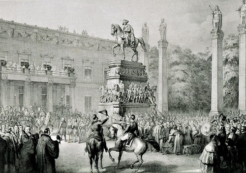 Glaubt man dem biedermeierlichen Satireblatt "Kladderadatsch", dann waren der königliche Hof und die Spitzen der Berliner Gesellschaft bei der Denkmalsenthüllung ganz unter sich. Das Journal veröffentlichte folgendes Spottgedicht, verbunden mit einer Ansicht des Monuments, das von Neugierigen begafft wird: "Der König rief! - es sank die Emballage,/ Und frei von jeder Hülle strahlte die Visage /Des Mannes, der durch Geist wie durch Courage / In der Geschichte wohnen wird stets Bel-Etage! / Doch leider, ach! Gesperrt war die Passage / Für uns, die wir gehören zur "Bagage"! /Und da wir meiden gern Carambolage /So blieben wir -o schreckliche Blamage! - / Ruhig zu Haus' in unserer Menage /In einer Sprache, wie bekanntlich sie Usage / Beim ,größten König' und beim Kladderadage."