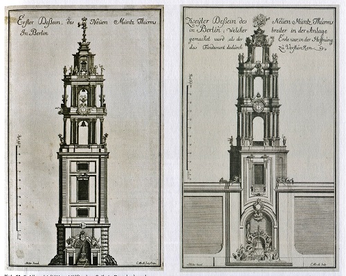 Friedrich I. verlangte nach einem neuen Münzturm mit einem Glockenspiel darin. Wie sein Vorgänger sollte er die Wasserspiele auf dem Lustgarten speisen. Missmutig ging der zum Schlossbaumeister erhobene Bildhauer an die Arbeit und führte das Bauwerk 1706 bis zur Höhe von 70 Metern auf. Doch da brach es in sich zusammen. Der auf sein Prestige bedachte Monarch war wütend und wischte den Einwand seines Baumeisters vom Tisch, dass die Planungen gut sind, das Erdreich aber instabil ist. Schlüter übertrieb nicht, denn bis heute bereitet es bei Baumaßnahmen in der Mitte der Stadt immer wieder große Probleme bereitet. Friedrich I. ließ nicht locker. Der Baumeister musste die Fundamente verstärken, seitlich errichtete Anbauten sollten dem Turm Halt geben und die Lasten auffangen. So wurde der auch Campanile genannte Turm neu aufgerichtet, doch zeigten sich schon bald Risse und Absenkungen. So war das stolze Bauwerk nicht mehr zu retten und musste am 25. Juni 1706 abgebrochen werden. Wutschnaubend entließ der König den Schlossbaumeister aus seinem Amt, beschäftigte ihn aber weiter als Hofbildhauer. "Es hat mein Unglück bei diesem meinem Vornehmen auf mich gelauert [...], indem bey meiner fleißigen und mühsamen Arbeit wider aller mein Vermuthen bey dem Thurm ein Eckpfeiler zu sinken [...] sich angefangen", versuchte der unglückliche Künstler, sich bei seinem Herren zu entschuldigen.