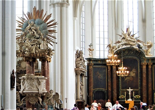 Eines der Hauptwerke Schlüterscher Bildhauerkunst ist die figurenreiche Kanzel in der Marienkirche. Von der Witwe eines kurfürstlichen Kammersekretärs gestiftet und 1703 vollendet, besteht die in einen mittelalterlichen Gewölbepfeiler montierte Kanzel aus einem aus Holz und Alabaster bestehenden Korb, den man über eine geschwungene Treppe betreten kann. Die beiden Engel aus Marmor davor sind durch Bänder mit der Kanzel verbunden. Der hölzerne Schalldeckel über dem Kanzelkorb ist reich mit musizierenden Engeln und vergoldeten Strahlen hinter dunklen Wolken geschmückt. Wegen ihrer ungewöhnlichen Bauart wurde die Kanzel schon im 18. Jahrhundert als technische Großtat gewürdigt. So stellte der Schriftsteller, Verleger und Vertreter der Berliner Aufklärung Friedrich Nicolai in seiner "Beschreibung der Königlichen Residenzstädte Berlin Potsdam" (1786) anerkennend fest: "Dieses kühne Unternehmen, vielleicht das einzige seiner Art, verdient die Aufmerksamkeit und den Beyfall der Kenner". Wenn man Schlüters Meisterwerk näher betrachtet, sieht man am Kanzelkorb im Stil der Zeit gestaltete Seitenreliefs der Spes (Hoffnung) und der Caritas (Nächstenliebe) sowie vorn die Darstellung von Johannes dem Täufer, der auf das Lamm Gottes als Symbol für die Auferstehung Christi und Hoffnungszeichen für die Welt deutet. Ihm zur Seite hat der Bildhauer einen Mann in Denkerpose und einer Frau gesetzt, die sich nachdenklich an die Stirn fasst.