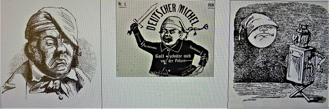 Der Berliner Satiriker Adolf Glaßbrenner (1810-1876) fasste seinen Widerwillen gegen die ständig zaudernde und ängstliche Symbolfigur der Deutschen in Gedichten und Glossen zusammen. Er traf den Nerv seiner Zeit, als er schrieb: "Der deutsche Michel beim Fortschritt" heißt es: "Immer langsam voran! Immer langsam voran, / Dass der deutsche Michel nachkommen kann! / Der Fortschritt, der nimmt auch gar kein End'; / 'S ist als ob der liebe Gott die Polizei nicht kennt! [...] Immer langsam voran! Immer langsam voran, / Dass der deutsche Michel nachkommen kann. / In Cottbus war neulich eine Revolution; / Da hatten sie einen Sergeanten beim Kragen schon! / [...] Immer langsam voran! Immer langsam voran, / Dass der deutsche Michel nachkommen kann. / Heut sorg' ich nicht für's Völkerwohl, / Sonst wird mir kalt mein Sauerkohl."