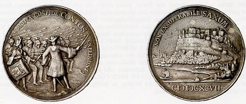 Prinz Conti schickt auf der Medaille von 1697 seine Truppen zur hoch über der Elbe gelegenen, uneinnehmbaren Festung Königstein, hat aber keinen Erfolg.