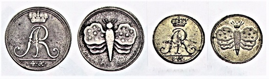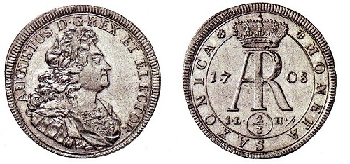 Das Monogramm AR für Augustus Rex (König August) erscheint auf dem Zweidritteltaler von 1708 und weiteren bis 1710 geprägten Kursmünzen, aber auch auf dem so genannten Schmetterlingstaler zu 32 Groschen ohne Jahreszahl und kleineren Werten mit diesem Motiv. Seine Bedeutung ist nicht geklärt. Vielleicht will das ungewöhnliche Bild andeuten, dass aus einer Raupe ein prächtiger Falter wird, so wie Sachsen unter August dem Starken wieder schön wird und seine alte Kraft und Herrlichkeit zurück gewinnt.